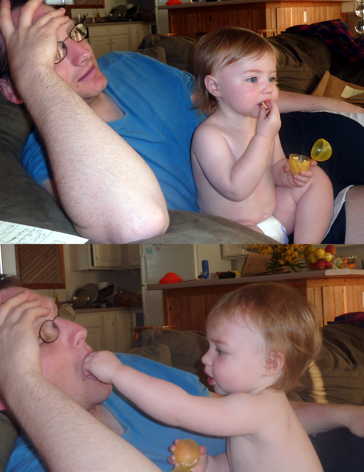 Alaina cared about were the sweet potato puffs in her eggs. After she shared a few with Drew he asked Liz if she had any jelly beans in her basket for him. Nope, only Barbie fruit snacks. He looked at me like, "what the?" and I informed him that this year I figured the bunny should only leave Liz treats that she actually likes (instead of including treats that he and I like as in years past). Incidently, when Drew was slow to get up Sunday morning Lizzie said enticingly, "Come on Daddy, I bet I have some chocolate in my basket that I won't want to eat."